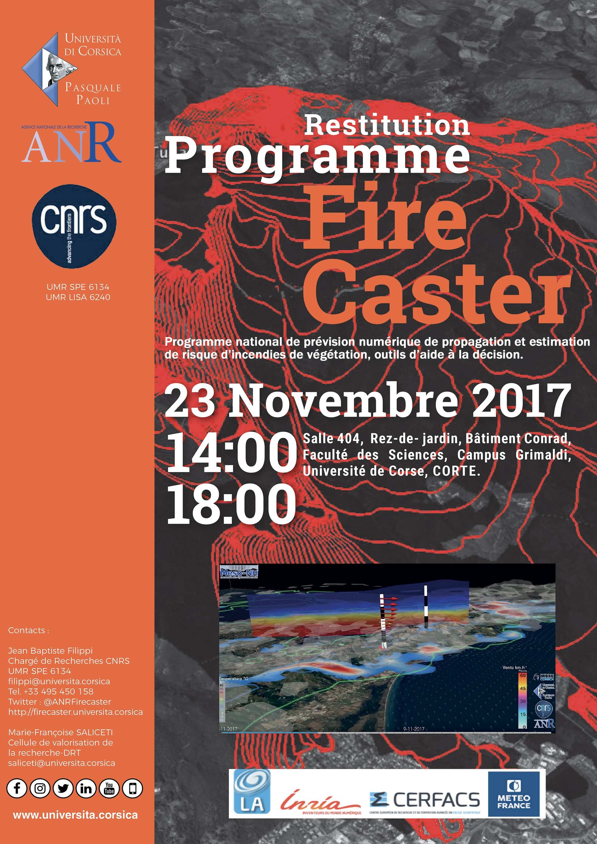 Firecaster, est un programme national financé et labellisé par l'Agence Nationale de la Recherche (ANR), coordonné par Jean Baptiste FILIPPI, Chargé de recherches CNRS à l'Université de Corse. Deux laboratoires de l’Université de Corse, Sciences Pour l’Environnement, (UMR CNRS SPE 6134) et Lieux, Identités, eSpaces et Activités (UMR CNRS LISA 6240) y travaillent en collaboration avec des partenaires nationaux : le Centre de Recherche Météorologiques (Météo-France), l’Institut National de Recherche en Informatique et en Automatique (INRIA), le Centre Européen de Recherche et de Formation avancée en Calcul Scientifique (CERFACS) et le Laboratoire d'Aérologie de Toulouse (LA).
